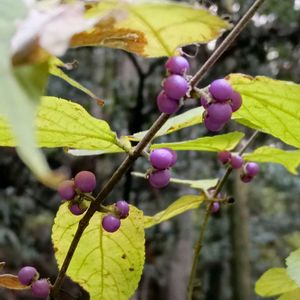 ヤブムラサキ(藪紫) シソ科ムラサキシキブ属の落葉低木 分布 本州(宮城県以南)、四国、九州 紫色の実は、少し、艶がなくなり、色あせてきたように思いますが、 葉っぱが黄色く色づいてくると、 実が目立ってきます。 黄葉した葉っぱが散る頃には、 冬芽ができるそうです😆 実を観賞するより、モフモフした葉っぱのビロードのような感触を楽しみます😄 名前にヤブがついていますが、 藪の中よりも、山地の林下で、よく、見かけます。
