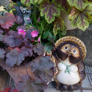 🏷️タヌキ祭り 参加します♡ 1年ぶりに登場の信楽焼の狸さん♡ この日のために綺麗にお顔拭いてもらい ました🤭どこ見てるのかな🤭 ヒューケラさんの葉っぱが大きくなってきました😂 オキザリスのお花も今限定で咲いてます🌸🌸 番犬のももちゃん🐕️も友情出演です😆