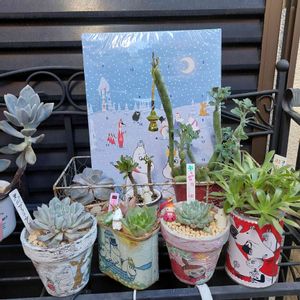 🏷️ムーミンの日 参加します😊 バックはムーミンクリスマスカウントダウンカレンダー📆です😉 12月に、入るとクリスマスまで、日付ごとにめくって行きます😁中にムーミン一家の形をしたチョコ🍫が入ってます🎵毎日違うので楽しいですよ😂 ムーミンの鉢が増えて賑やかになりました😂右端はいちごさんからのムーミンのお菓子の缶にアエオさんを植えました🎶さくら餅子さんからのリメ缶可愛い💕左奥の鉢はミィーがチラ見えでした🙏奥のニョロニョロに似た七宝樹と黒法師に毛が🤭💦葉っぱ🌱が増えてきました😂