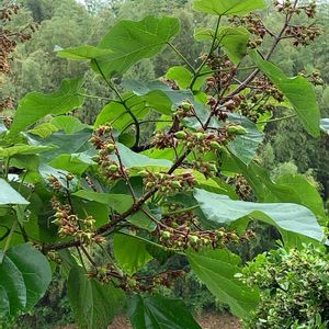 他に歩く人などいない、 山の中の歩道の無い国道🚚🚙🚗 ドライバーさん、こんなところに歩行者なんて運転しにくいでしょ、ゴメンね😅 バス🚌は一時間半後なので🙏 法面の上は野生の木? 頭上に見慣れた花✨ だけど、葉っぱギザギザ😄 信号が無いので向こうに渡り、全体像も撮ってみた。大きな木🌳😊 6/17 🤳