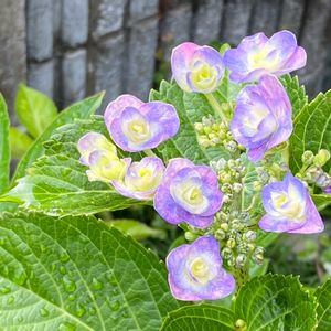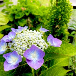 雨上がりました〜 ほんのり色づき始めた薄紫色のガクアジサイ こちらは、まぁるいガクの八重咲きタイプです(*´꒳`*)♬
