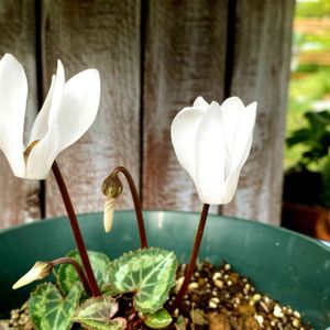 梅雨時期に ガーデンシクラメンが咲きました!! 朝、ちょっとだけ陽が当たる所に置いておいたのが良かったのかな(•ૅㅁ•)?? なんだか涼しげですね👍