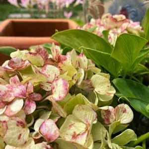 ご近所さんから挿し木用に分けていただいた秋色の紫陽花(*´꒳`*)❤︎ 咲き始めは、真っ白✳︎・*.・ そのあとほんのり水色に変わって ライムグリーンになり、 ピンクが混ざってきて 最後は濃いピンク色になるそうです✨