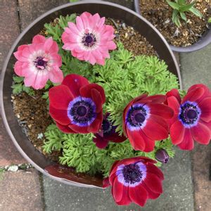 アネモネの寄せ植え✨ 見切り品コーナーからお迎えしたアネモネチョコレート🍫 時間かかったけど無事咲きました😊