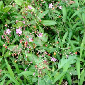 今日のお花ミソハギ、 拡大すると別の花のように見えます 3尺バーベナは、、小さな花の集まりですが、立ち姿が良いですよね ガウラは風に揺られています ハナトラノオは、毎年咲いてくれますが、よく倒れてしまいます ハゼランとっても小さな花 午後3時ごろ咲くので別名サンジソウ 小さな小さな花ですが、あちこちで咲く生命力の強い花ですね 雑草に負けずに咲いている 小さな花達でした 暑い日々、無理せずに庭を楽しみましょう 実は、 シモツケに絡まったカラスウリを 引っ張ったら アシナガバチが数匹飛び出した これはいけないと 孫と一緒にバックバック 刺されなくて良かったです😅