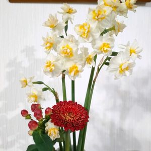 積雪に備えて、、、 八重咲きニホンスイセンをカット✂️ 長いこと咲いてくれて、ほぼ終わりかけなんですけど🙏💕 少しだけ甘い香りが残っています😊 真っ赤なガーベラとヒペリカムと一緒に花瓶に飾りました💐 🏷️真っ赤な火曜日