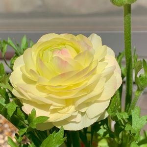 こんにちは☺️ ラナンキュラス 小春日和 今年はこの色でした! 昨年…出回ったばかりの蕾も無い苗🌱に出会ってお連れしてみました 白花にピンク色の縁どり🥰 優しい雰囲気で当たりかな〜 今しがた…こちらは風が出て来ました 今日も暖かくして良い1日をお過ごし下さいね🌸