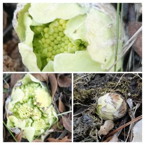 菊の蕾のような丸っこい花の集まり よくみると白い花びらがちらちら見え始めている 落ち葉の沢山ある裏の日陰の山道に生えていた もう少しすると茎も伸びて④のようになる よく天ぷらで出てくるのは、蕾の周りにある葉が、まだ覆いかぶさっている頃 ほろ苦くて、風味といっしょに季節を味わう料理だね