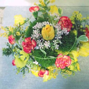 黄色のお花を使ったフラワーアレンジメント💐 ミモザ、黄色の薔薇、黄色のスイトピー、 そしてオレンジ色のスプレーカーネーション、 桜色のサクラコマチ、 緑色のテマリソウ、 仕上げにツルニチソウをふわっと。 派手、派手~🎶 部屋がとっても明るくなって気分もあがる😄🎶💞