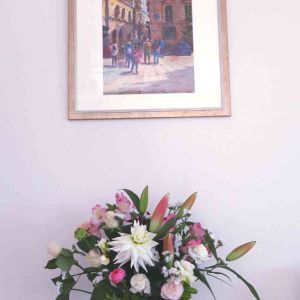 友達が描いた水彩画と私のフラワーアレンジメントのコラボ🎉