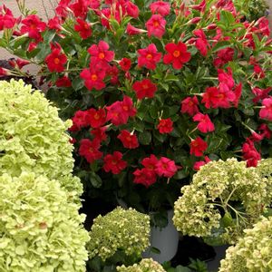 7月8日 サントリーフラワーズ サンパラソルクリムゾン & サンパラソルスカーレット の2色植え サンフラアンバサダー2022 でお迎え ただいま3年目の夏🎐❤️ 今年は咲き初めから 真夏日🔆。°続きのうえゲリラ豪雨⛈️ お花𖤣𖥧𖥣。𖥧𖧧たちにとっては過酷過ぎ🥵 このBIGなサンパラソルとアナベルの足元に 日陰を望む子たちが隠れてます 🏷️真っ赤な火曜日 参加させていただきます