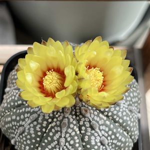 Tephrocactus geometricus テフロカクタス・ゲオメトリクス 今日はちゃんと咲きました〜🌸🎶 pic① 9:30 pic② 11:45 少し晴れ間が出て、全開に咲きました🌸 pic③ ゲオ、蓬莱宮、紫太陽 紫太陽は半開き…力尽きたか(∵`)?! pic④ 昨年と今年のゲオの花を比べてみた🌸 ↖️昨年咲いたゲオちゃんと ↘️今日咲いたゲオちゃん 昨年の花の方が大きく見える👀✨ この日は天気が良かったので、めっちゃ開いてるから…いや、今年の方が心持ち小さいような🤔💭 pic⑤ 雄しべを触ると動いたよ☝️😉 ⬆️触る前 ⬇️触った後 斜め上の雄しべをԅ( ˘꒳˘ ԅ)サワサワ ゲオ、蓬莱宮、紫太陽の花で 🏷可憐な火曜日 🏷ピンクワールドへ ようこそ(今日も💦) pic①の🐮コラージュで 🏷牛の日 参加させていただきます(⋆ᴗ͈ˬᴗ͈)” ゲオちゃんの花が大好き🩷 でも、子株も出してね🤗 出来たら、ミッキーみたいに頭に2つ… 🙏オナシャ~ス