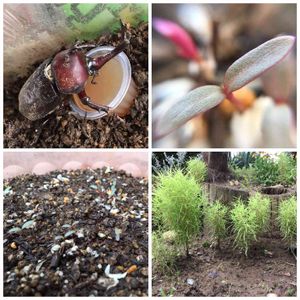 カブトムシ君、無事に脱皮しました👏 完全に脱皮して5日くらい経ち、やっとお食事場面を見れましたよ😊 右上、左下、千日紅の昨年の花柄の種を日曜日にまいて、芽が出ました🙌 車庫に放置していたものでも芽がちゃんと出ました💕 右下、こぼれ種で出てきたコキア💚 観察が楽しいです🎶