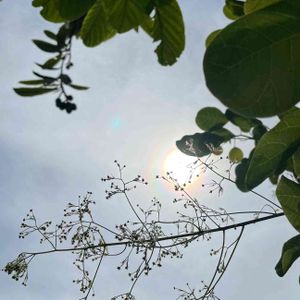 天気予報は☁ でも晴れてきましたよ☀️ 青空とまではいかないけれど、少し咲き始めたスモークツリーの蕾と、ビワの実のシルエット 🏷土曜はお空の発表会 参加させていただきます💙