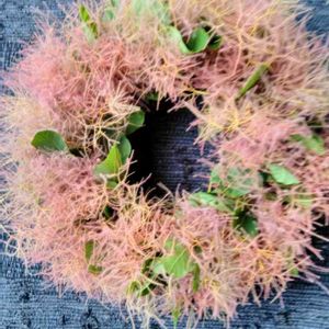 アナベルのリースを貝殻草とスモークツリーで飾って可愛く