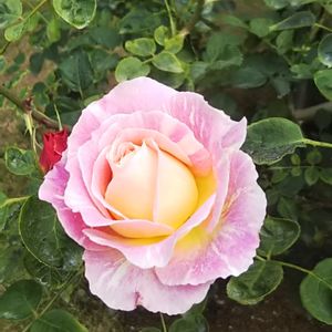 出勤前、空模様が気掛かりで上しか見てなかったら、、、 夜勤が明けて帰宅すると🏘️🏍️💨 玄関に薔薇の二番花🌹が開いていました😃 ちょっと、嬉しい😌🌸💕 故郷の川の氾濫が、早く収まりますように🙏🍀