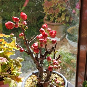 梅盆栽の次はこれ、ぼけ盆栽✨ 真っ赤な蕾❤ 明日には開くかな~🌼