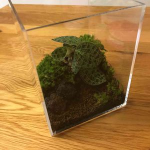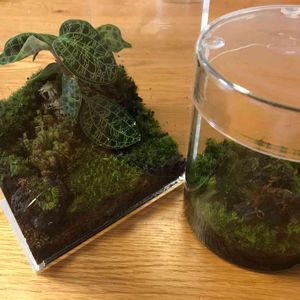 苔テラリウムデビュー。ジュエルオーキッドを植えたくてやったのですが、容器が小さかった😅ジュエルオーキッドは植え替えに弱いとどこかで見たので、水苔はそのままで周りにソイルを。