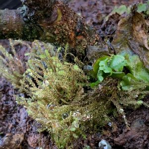 苔たちの熱く静かな戦いです! 2種類のコケが睨み合っています。 左はキノコみたいにポコポコした形のジンガサゴケ。 右は名前がわかりませんが、明るい黄緑色が綺麗なコケです。多分ホウオウゴケ科の何かだと思います。