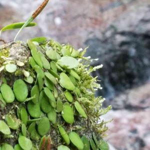 マメヅタ*豆蔦 常緑シダ植物 苔むした岩の上に沢山 繁っていました🌿 ぴょこんと飛び出た 胞子葉と丸い葉も可愛いです🌱