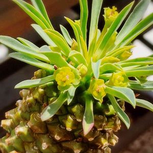 アップデートされて、使いにくくなったと思うのは私だけかしら⁉️前のが見やすかったな😑 寒さが続くので、夏型の子が心配でハウスチェックです😅 下の子 ユーフォルビア属 『 紅キリン 』 Euphorbia aggregata ポコポコ可愛いこの子💓 新芽が出てきているので、大丈夫そうε-(´∀`;)ホッ✨ 1周ぐるりとバランスよく育っていると、カキコ出来ないな😅 隙間の雑草が抜けません😂 上の子 名無しで迎えましたが、パイナップルコーンで流通している 『 蘇鉄キリン』であってるかな⁉️ お花が可愛く咲いてます🌼*・