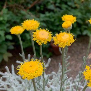 サントリナ 🌿 もしゃもしゃしてますが、お花も咲いてます。