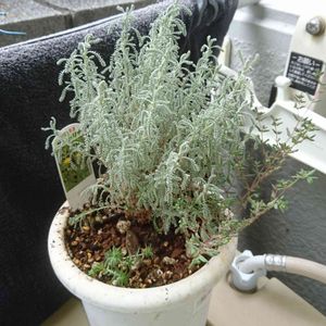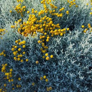 ほぼ放置のサントリナ☘️ ちゃんと可愛いらしいお花が咲いてます🌼 シルバーリーフを触ってみると、 やっぱりいい香り……🎶
