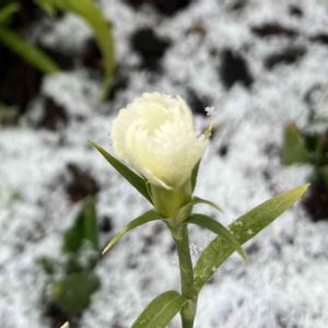 少し雪が降っています❄️ 秋に植えていたナデシコが一輪、 春を待ち侘びています。😊 もう少し❣️