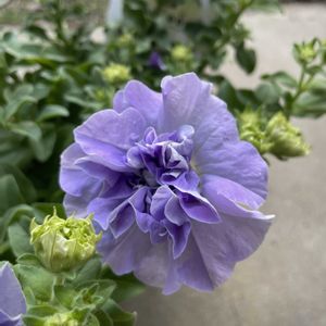 🏷️毎月8日は鉢の日に参加します🎵 八重咲きペチュニア パニエ ―ライトブルー― 夏に向けてペチュニアが元気です。 後方の木は夏椿(沙羅)、蕾がイッパイ!