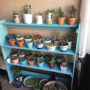 多肉ちゃん置く棚を探していたのですが、予算内で探すと希望の大きさがなく、良い大きさが見つかると予算越え😭。 仕方なく作りました。予算の半額。☺️ ホームセンターで板買ってきて、頭の中で設計図書いて...。のこぎり引いて、釘打って。何十年ぶりかの日曜大工。腰痛っ。 とりあえずイメージ通りにできました。