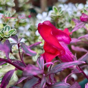 🏷️今日のお花 "キンギョソウ" 雨でリーフが倒れちゃいましたが お花と一緒で濃ゆい色💓💓 後に写っているのはハクチョウゲ こちらは純白の小花🤍🤍 たくさん咲いてるところ 2枚目にもUPしました✨ どちらも斑入りリーフです(*ฅ́˘ฅ̀*)♡︎🌿🌿