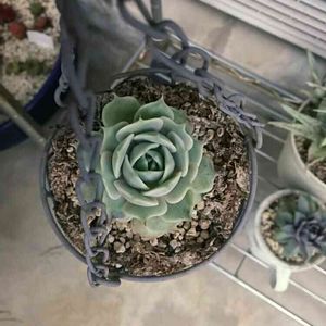 左のウスネ吊し直したよ😅 右の太葉と同じ針金のうねうねに引っ掻けてたけど、めっちゃ落ちる⤵⤵ 長いからか、下手なのか😓 取り合えず、全部飛んでっちゃう前に100均で多肉用にと買ってあったアイアンカゴが、表面ざらついてて良い感じ(°▽°)✨