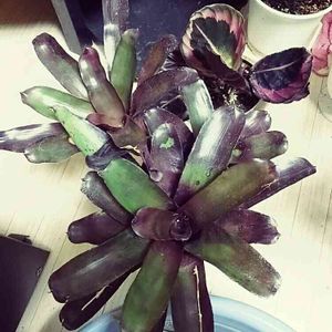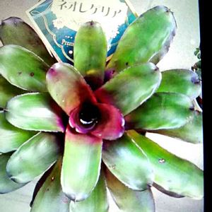 1個前のpicで左下に写っているネオレゲリアの2017年6月の購入時の写真📷 ガラケーで撮ったから画像が…(´・ω・`) 葉も中心の色ももっと暗い色です😓💦💦 今は子株が2個出て、この親株は小さくなっています😁 色も黒寄りの紫でカッコイイ❇お気に入り💖