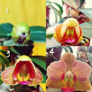 謎花胡蝶蘭④ ファレノ・プティが咲いた‼️ 予想外の色でビックリ😆 花弁の色は、土台が黄色で上にピンクがのってるって感じ! 凄い…みんなピンク系だけど、1個も被らなかったー🙌🎶