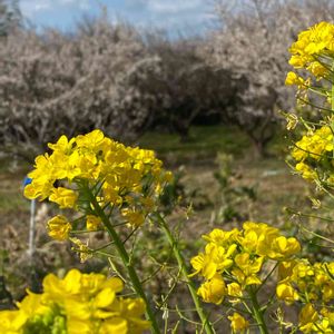 広々とした中に💖 梅の木々をバックに菜の花をカシャリ✨ 菜の花さん、可愛く撮れましたよ(⌒▽⌒)