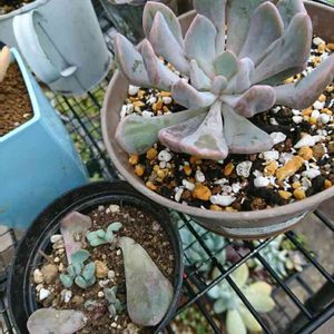 トップシーデビーでしょうか?新井園芸さんの苗はおまけ付きが多いです。 黒鉢は随分と大きくなった葉挿し?がいっぱい。 デビーにしては色が鈍すぎてる気がするし、何でしょね?
