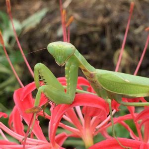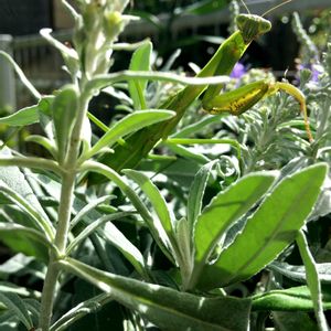 なんか用? 思い切り目が合いました💦 ヤモリ、ミミズなんかは触れますがカマキリだけは無理‼️ コワイ。 バッタが葉を穴だらけにするから このカマキリに頑張ってもらわなきゃね
