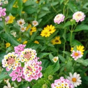 🍀おはようございます🍀 ランタナと種蒔きジニアが 仲良しさん💕 ②こぼれ種っ子のノゲイトウ❣ ③6/19に投稿した アルテルナンテラ リトルロマンス❣ あのシックな🌿は今は グリーンに💚 ④地植えの薔薇 ブラスバンド🌹 昨日の久々の☔を 喜んでいました😊