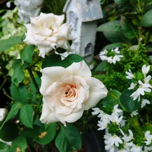降り続く雨☔🌧 ステムの長い薔薇は 俯いてしまいます ✄して室内に飾りました 零れ種で殖えたオルレア🤍❁が いい仕事をしてくれます😊💕
