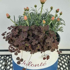 ローダンセマム・ムーン エンジェルクローバー ガーネットリングの寄せ植え ブリキ鉢に入れてみました😊 いくつか咲いたら投稿しようと思っていましたが、なかなか咲かないので投稿します😊