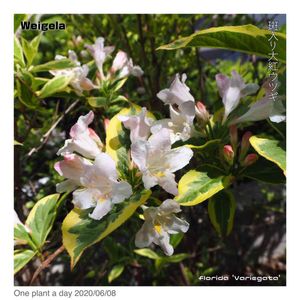 One plant a day. Weigela florida 'Variegata' 斑入り大紅ウツギ 2007年最初から植樹されていた生垣。”大紅“とついているのに赤くも大きくもない花です。斑入りの葉と沢山の花で初夏の庭が賑わいます😉