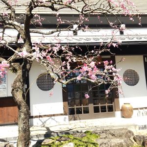 昨日立ち寄ったギャラリーの外観とピンク色の紅梅🌸💙 内側も外側も癒やされる素敵な場所でした💞
