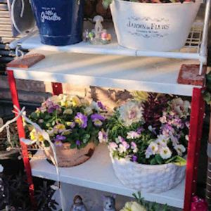 さにべる🌸にて 八重咲きパンジー フェアリーチュール ハーデン・ケルン パンジーハウスにて ネメシア エッセンシャル ブラックベリー 1株 赤いクローバーとネメシアを手前に後方にフェアリーチュール 2株入れて寄せ植えにしました٩(*´꒳ `*)۶🎶