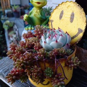 実家近くのJAひぞっこの植物コーナーに地域の方の多肉が出品されています😊 ⬇️GSのさきゅまるさんも置いていて実家に行ったときは時々のぞいています。寄せ植えも可愛い😊黄色コーナー🟡 ⬆️違う方の多肉ですが、夏に⭐︎にしてしまったセダムが可愛くて安かったのでお迎えしてしまいました。 ⬅️何回見ても名前が覚えられないベッラデインヴェルノ ➡️斑入りパリダム