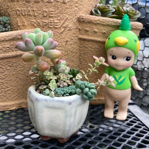 この鉢、前はミニサボテンの寄せ植えをしていたのですが、成長していっぱいになったので別の寄せ植えに移しました。 で、その時たまたま植え直した、ポスト下セダム畑のバケツに植えてあった、ミニミニリトルミッシー(すごく葉が小さく育っています)を植えようと思い… ついでにいろいろ寄せ植えしてみました。 かなりミニミニサイズの苗の寄せ植えです。 右手前にあるパープルヘイズが大きく見えますが、これは普通サイズで、他が小さいんです😆 ソニエンくんを持ってる方ならこのサイズ感がおわかりになるかと…😄