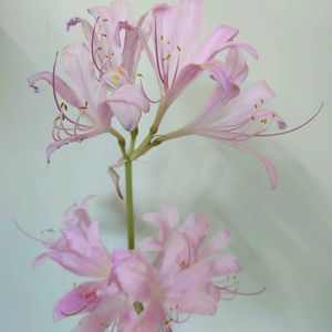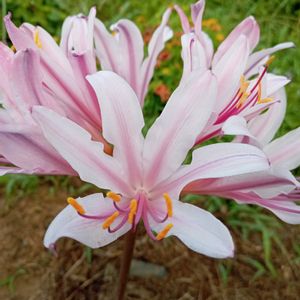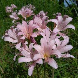 夏水仙(ナツズイセン) ヒガンバナ科ヒガンバナ属の多年草。リコリス・ロンギツバとリコリス・スプレンゲリの雑種と推定されている。古い時代に中国から渡来したといわれる。観賞用に栽培されるほか、人里近くの日当たりのよい草地にしばしば野生化している。葉は早春に伸びだし、粉白を帯びた緑色で、長さ20〜30㎝、幅1.8〜2.5㎝。初夏には枯れる。花期は8~9月。花茎は高さ50〜70㎝になり、淡紅紫色の花を数個つける。花は直径約8㎝とヒガンバナ属としては最も大きく、横向きに開く。花被片はやや反り返る。果実はできず鱗茎で殖える。花が終わった後、一旦地上部から姿が消える。早春にスイセンに似た葉を出し、葉を茂らせて鱗茎に養分を蓄えて、葉は初夏に枯れる。 葉がスイセンに似ていて、花が夏に咲くことが名前の由来。開花期に葉がないことから裸百合(ハダカユリ)とも呼ばれる。他に、毒水仙(ドクズイセン)、傾城花(ケイセイバナ/傾城💬絶世の美女または遊女)、属名のリコリスと呼ばれることもある。 出典『野に咲く花』『都会の草花図鑑』『夏の野草』『ボタニカルアートで楽しむ花の博物図鑑』