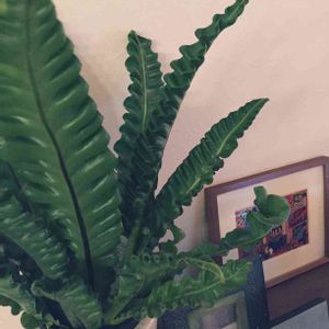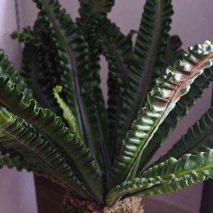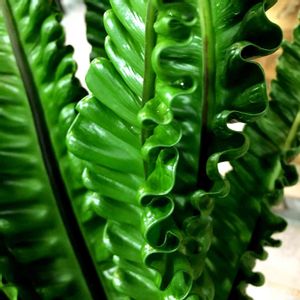 涼しげなシダ植物、繊細な葉姿ばかりではありません。 光沢感のある葉には強いウェーブがかかり、天を仰ぐような姿も相まって、力強い生命力の象徴のようです。 中央からくるんと飛び出る新芽は、ピチピチと水を弾く音が今にも聞こえてきそうなほど瑞々しい。シダならではの魅力もしっかり併せ持ちます。
