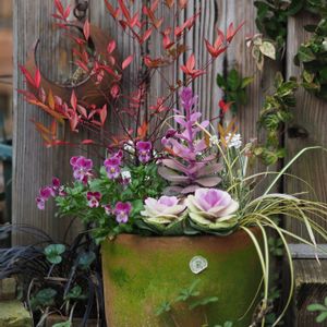 ◆いつもの箱庭 枕木の下に置いてある寄せ植え!! 葉ボタンの薹が立ってきましたが まだまだ頑張ってもらわねば...
