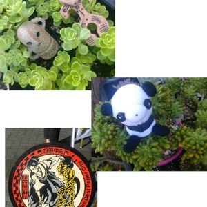 🏷パンダの日 🏷つぶつぶの日 🏷ハニワの日 ↖fukumomoさんに頂いた土偶ちゃんのブローチ さつま万年草、増殖中 お嫁に出しますよ〜 ↘まつぴよさんのパンダちゃん🐼 パンダちゃんが、乗ってる綴化でつぶつぶの日に参加します。 ↙昨日愛媛で行われた「書道パフォーマンス甲子園」 姪っ子が出ていました😁 こんなマンホールまで有るのですね。