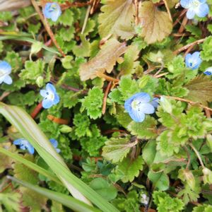 イヌフグリの群を見つけました。 と思ったら、花の色が青く濃いので、外来種のオオイヌフグリのようです。 オオバコ科クワガタソウ属 安威川の河川敷で。